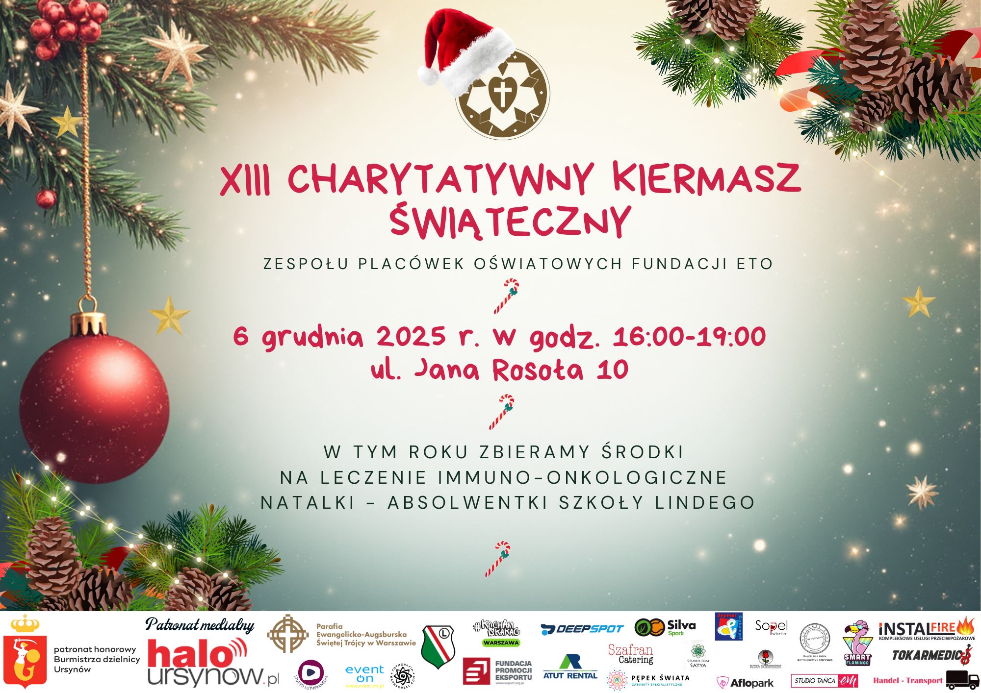 Serdecznie zapraszamy na XIII Charytatywny Kiermasz Świąteczny, który odbędzie się w sobotę 6 grudnia 2025 r. w godz. 16:00-19:00 na dziedzińcu Zespołu Placówek Oświatowych Fundacji ETO przy ul. Jana Rosoła 10 w Warszawie. Celem zbiórki w tym roku będzie wsparcie leczenia immuno-onkologicznego Natalki Marciniak – absolwentki SP Lindego, która od 2 lat dzielnie walczy z glejakiem wysokiego stopnia wg klasyfikacji WHO. Ona i Jej rodzice bardzo liczą na naszą pomoc! Natalka jest podopieczną Fundacji Dzieciom „Zdążyć z Pomocą”.